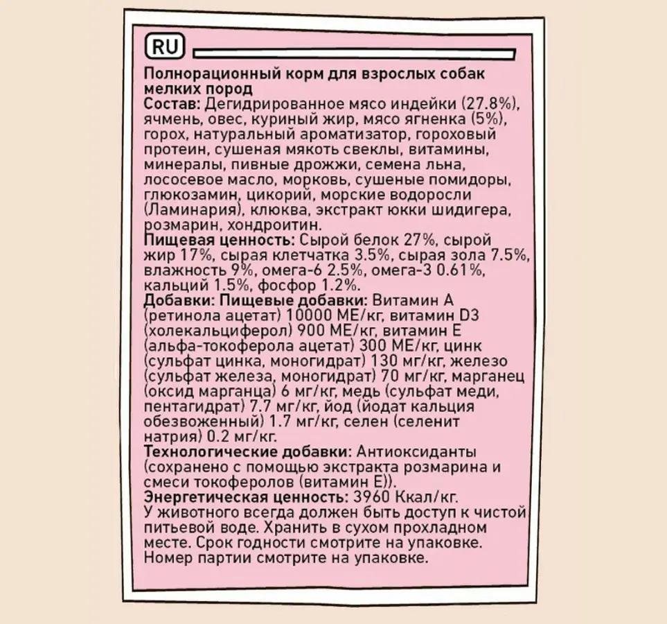 Энергетическая ценность корма составляет 3960 Ккал/кг — этого достаточно, чтобы обеспечить собаку энергией на весь день. Сбалансированное содержание белков (27%) и жиров (17%) поддерживает мышечный тонус и общую выносливость, что особенно важно для маленьких, но очень подвижных собак.