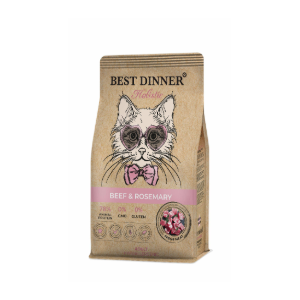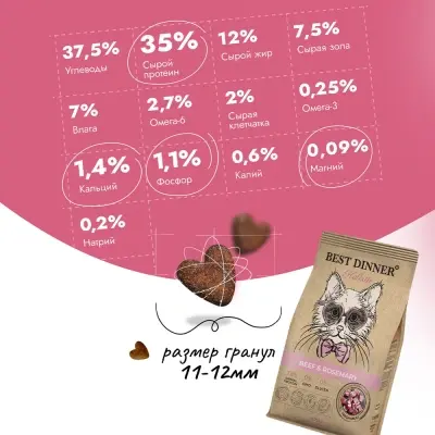 Высококачественный низкозерновой рацион для кошек Best Dinner с говядиной и розмарином не оставит равнодушным ни одного пушистого гурмана. Свежее мясо говдины с добавлением индейки обладают высокой вкусовой привлекательностью и не нагружают работу желудочно кишечного тракта. Ароматный розмарин не только повышает вкусовую привлекательность корма, но и улучшают работу ЖКТ, а добавленные яблоки и корень цикория обеспечивают питание и развитие полезной кишечной микрофлоры. Добавленный DL -метионин профилактирует развитие мочекаменной болезни. Гранулы в форме сердечек не оставят равнодушными даже самых привередливых кошек.
