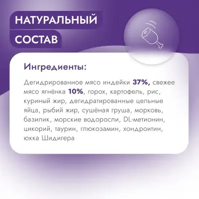 Дегидрированное мясо индейки (37%), свежее мясо ягненка 10%, горох, картофель, рис, куриный жир, дегидратированные цельные яйца, рыбий жир, сушёная груша, морковь, базилик, морские водоросли, DL-метиононин, цикорий, таурин, глюкозамин, хондроитин, юкка Шидигера.