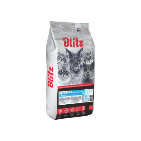 Blitz Sterilised Cats Chicken — это полнорационный сухой корм класса суперпремиум, разработанный с учётом потребностей стерилизованных кошек и кастрированных котов. Рацион тщательно сбалансирован по всем макро- и микроэлементам и подходит для постоянного кормления животных. Единственное, о чём следует позаботиться владельцу, — это свежая вода. Blitz Sterilised содержит оптимальное количество белка и при этом чуть меньше жира, чем другие корма «Блиц» для взрослых кошек. Он идеально подойдёт питомцам после стерилизации, а также малоподвижным кошкам, склонным к набору веса.