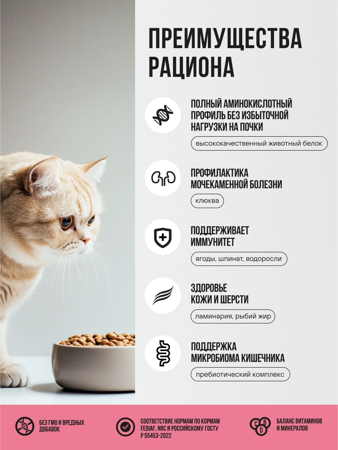 - Соответствует нормам по кормам FEDIAF, NRC и российскому ГОСТу Р 55453-2022.