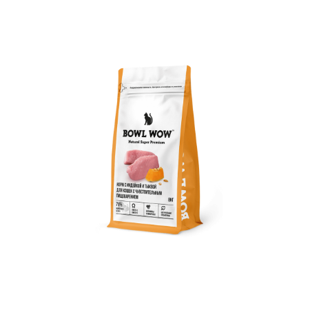 Сухой корм для взрослых кошек с чувствительным пищеварением с индейкой, курицей и тыквой BOWL WOW 8кг