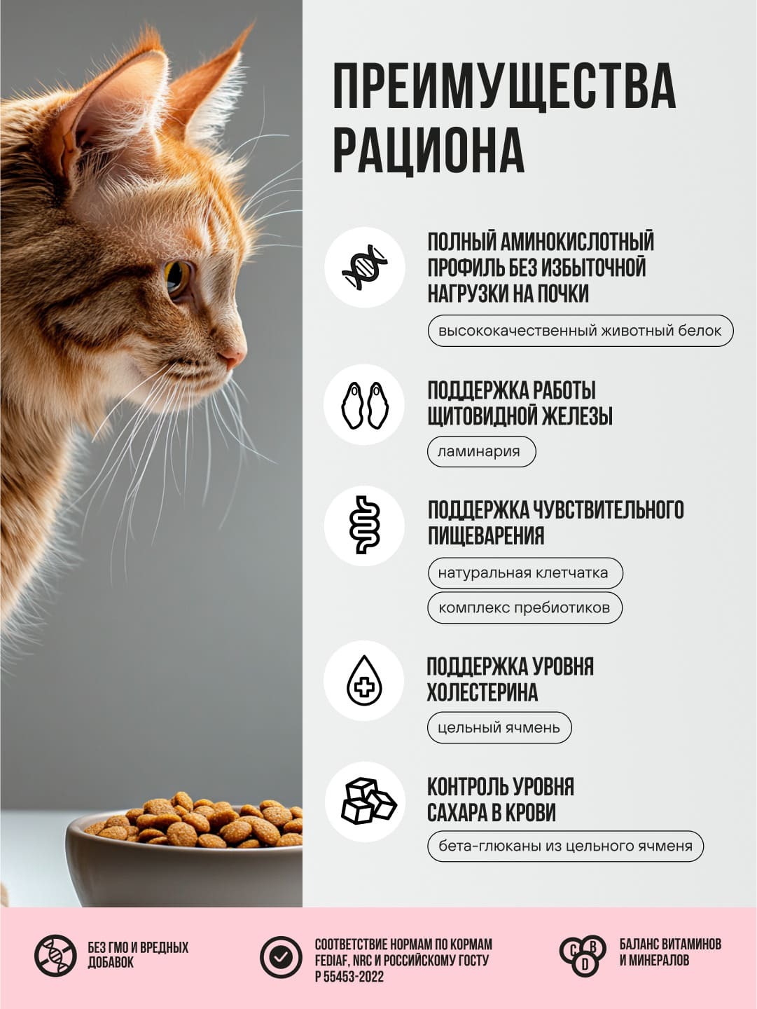- L-карнитин способствует нормализации липидного обмена и помогает поддерживать здоровый вес кошки.