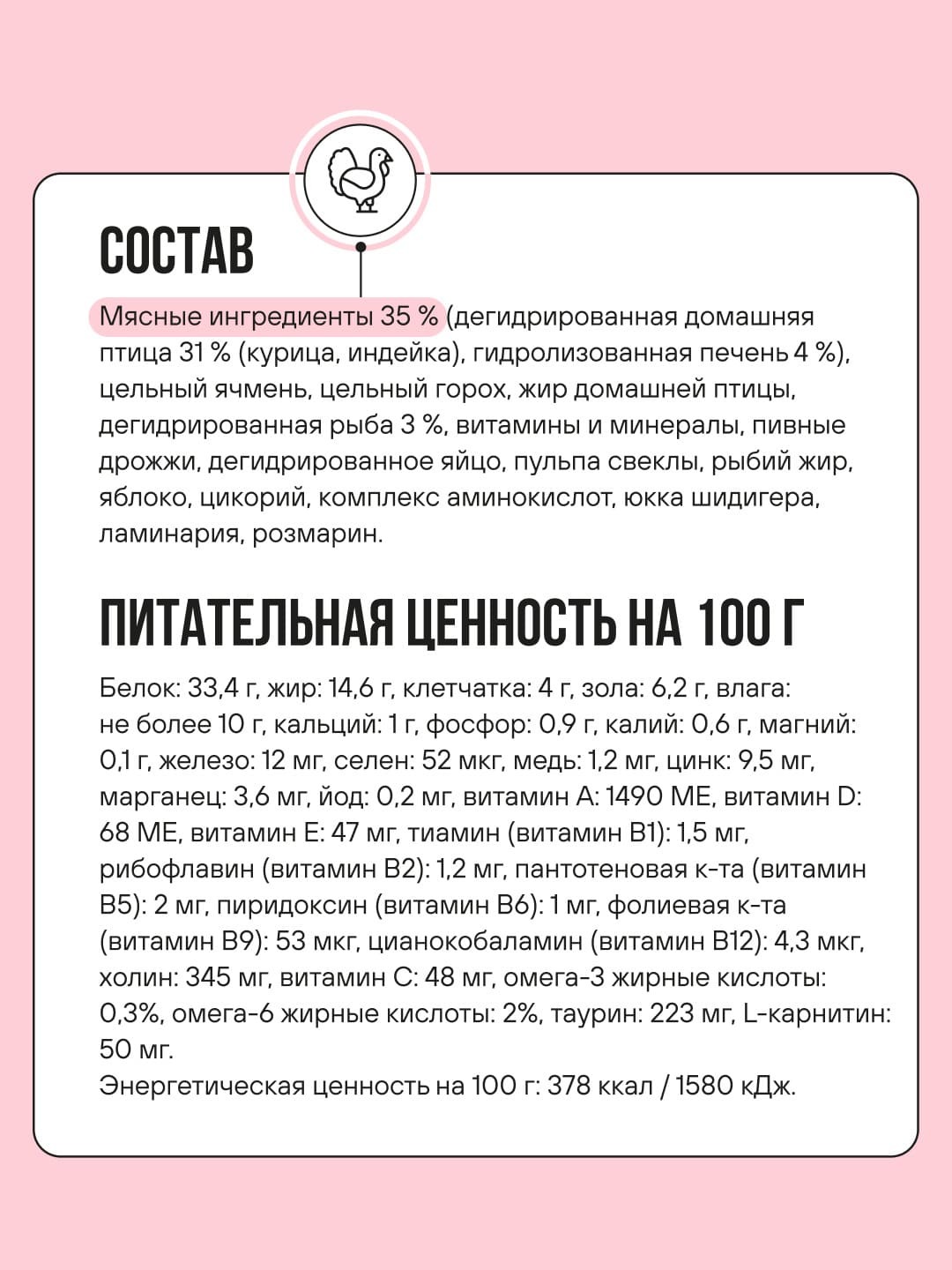 мясные ингредиенты 35 % (дегидрированная домашняя птица 31 % (курица, индейка), гидролизованная печень 4 %), цельный ячмень, цельный горох, жир домашней птицы, дегидрированная рыба 3 %, витамины и минералы, пивные дрожжи, дегидрированное яйцо, пульпа свеклы, рыбий жир, яблоко, цикорий, комплекс аминокислот, юкка шидигера, ламинария, розмарин