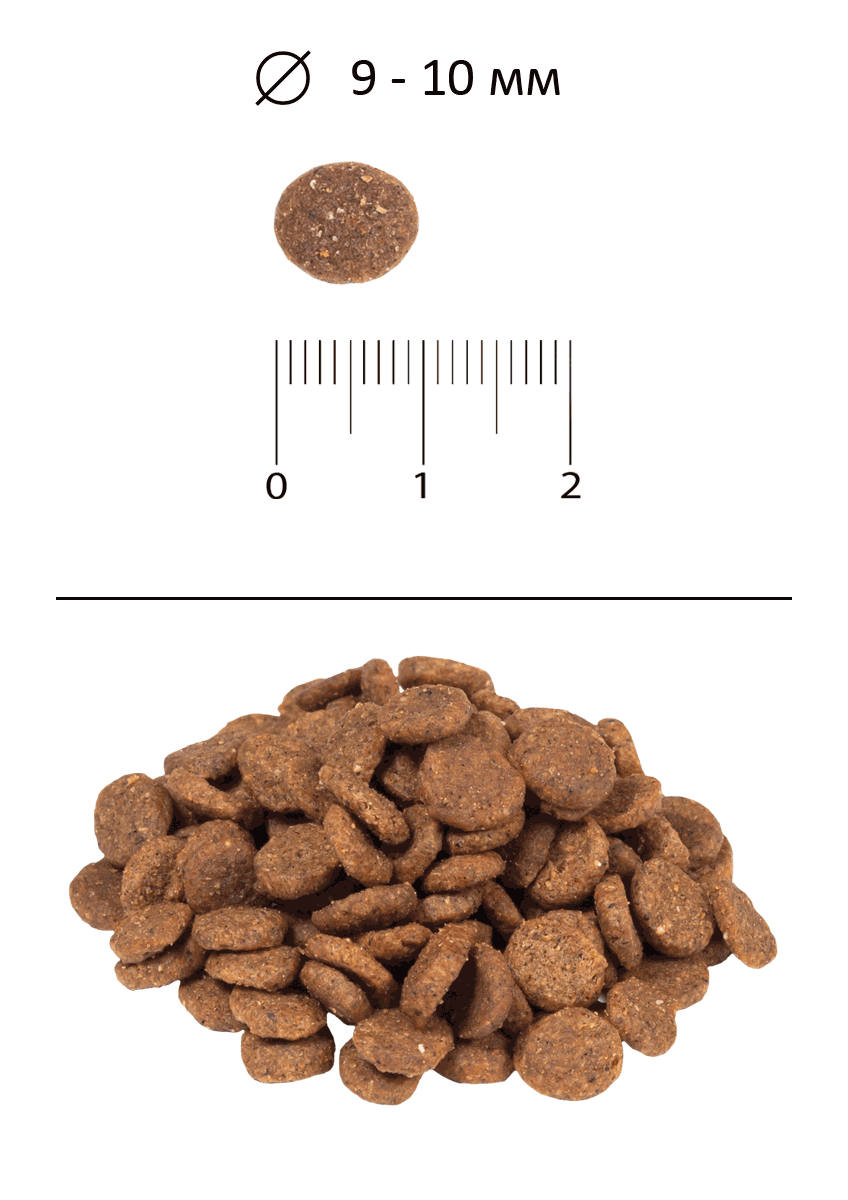 Состав: Дегидрированное мясо курицы (26%), цельная кукуруза, рис, гидролизованный белок, сушёная мякоть свеклы, кукурузные рыльца, дегидратированная и гидролизованная куриная печень, рыбий и куриный жир, дегидратированное яйцо, дрожжи — источник мананноолигосахаридов (MOS), яблоко сушёное, регулятор кислотности, антиоксиданты (витамин Е и экстракт розмарина), метионин, инулин — фруктоолигосахарид (FOS), пробиотики — живые микроорганизмы Bacillus subtilis и Bacillus licheniformis, фенхель, юкка Шидигера, фукус, витамины и минералы.