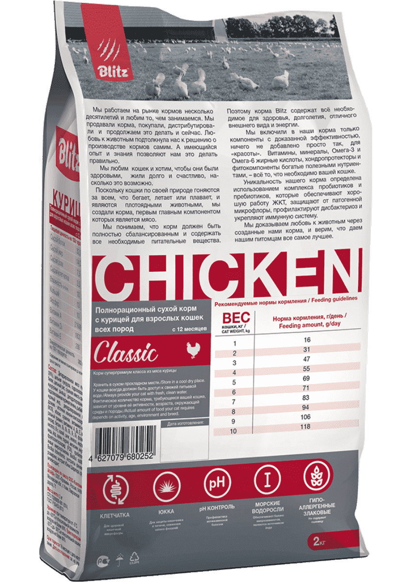- Корм Blitz "Курица" для взрослых кошек содержит ненасыщенные жирные кислоты Омега-3 и Омега-6, обеспечивающие иммунитет, здоровую кожу и отличную шерсть. Он включает качественные низкоаллергенные зерновые культуры: рис и кукурузу. Не содержит пшеницу, зачастую являющуюся причиной аллергии.