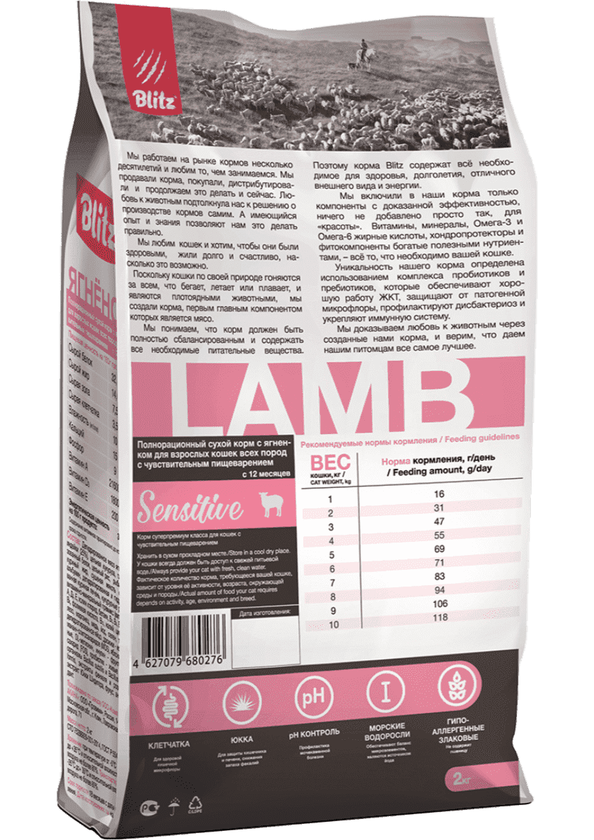 Полнорационный сухой корм Blitz For Adult Cats Lamb порадует даже самых привередливых питомцев. Рацион "Блиц" - Ягнёнок" удовлетворяет жизненные потребности взрослых кошек, обеспечивает крепкое здоровье и отличный внешний вид, способствует профилактике распространённых заболеваний, укрепляет иммунную систему животного.