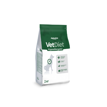Сухой полнорационный диетический корм AlphaPet VetDiet для взрослых собак рекомендованный при пищевой аллергии и непереносимости ингредиентов.