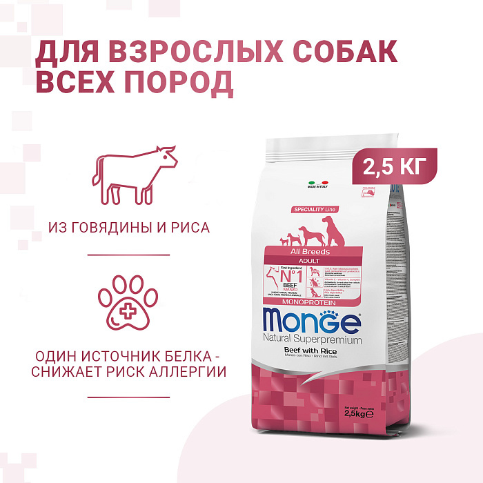 Monge (Монж) Dog Speciality Line Monoprotein сухой корм из мяса говядины с рисом для взрослых собак всех пород 2,5 кг.