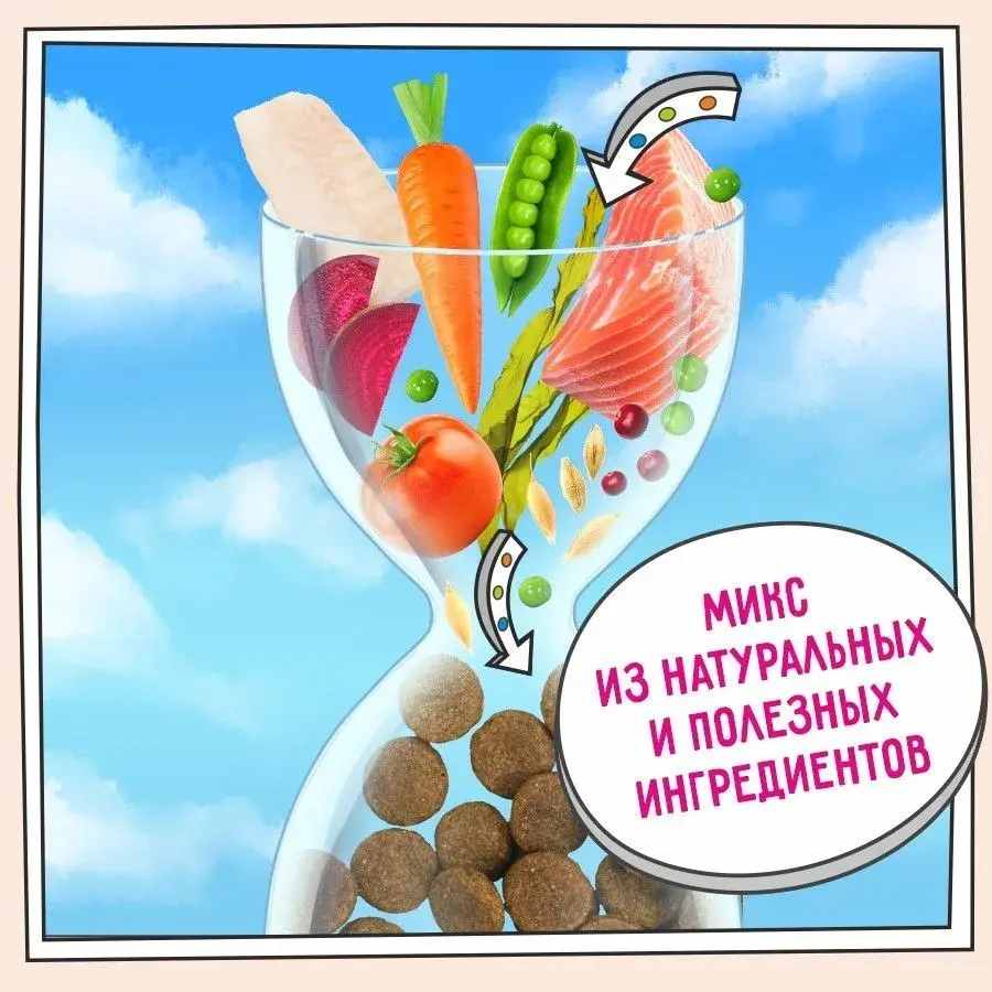 Рецептура обогащена морскими водорослями, которые насыщают шерсть животного красивым блеском и насыщенным цветом, а также овощами, ягодами и травами — источниками витаминов, минералов и клетчатки. Такой подход помогает поддерживать общее здоровье собаки и укреплять её иммунитет.