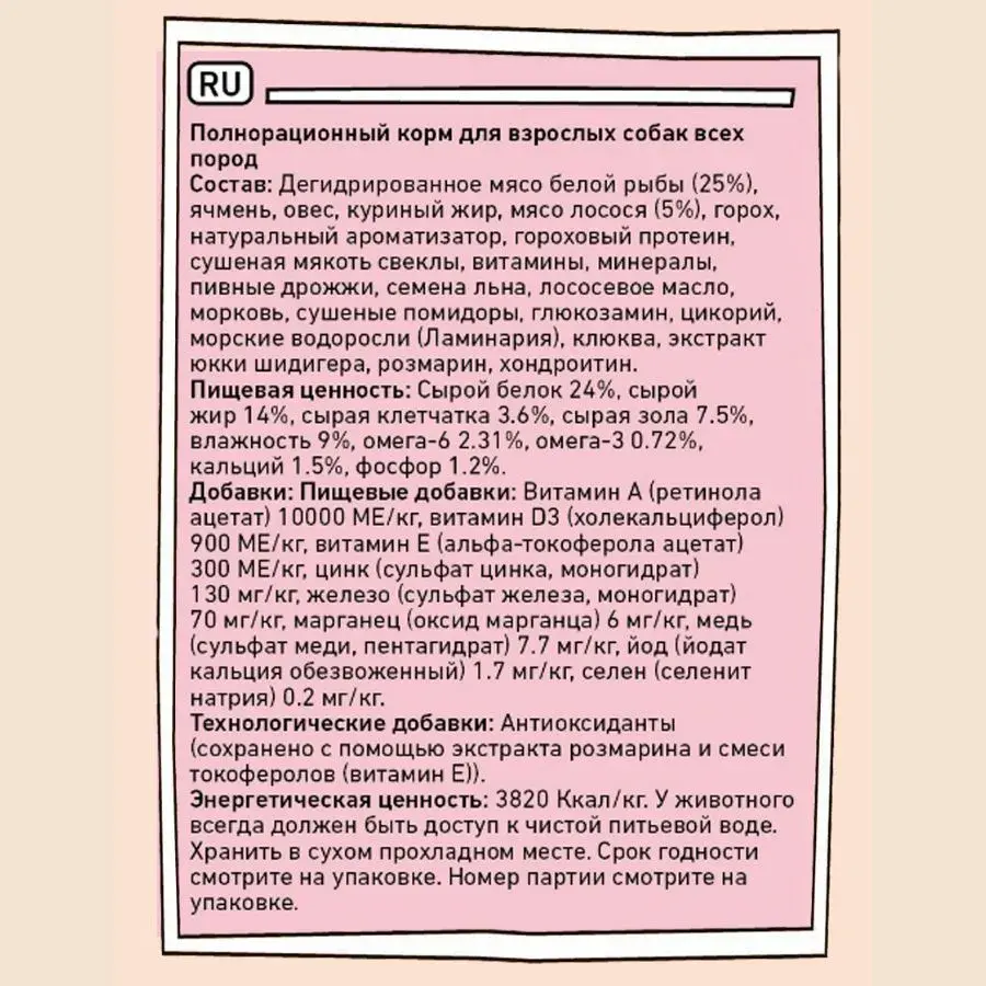 Корм содержит 25% дегидрированного мяса белой рыбы, 5% мяса лосося, а также ячмень, овес, куриный жир, горох, натуральные ароматизаторы, пивные дрожжи, семена льна, морковь, сушеные помидоры, морские водоросли, клюкву, розмарин и экстракт юкки. Пищевая ценность: 24% сырого белка, 14% жира, 3,6% клетчатки, 7,5% сырой золы, 9% влажности, сбалансированное содержание кальция (1,5%) и фосфора (1,2%).