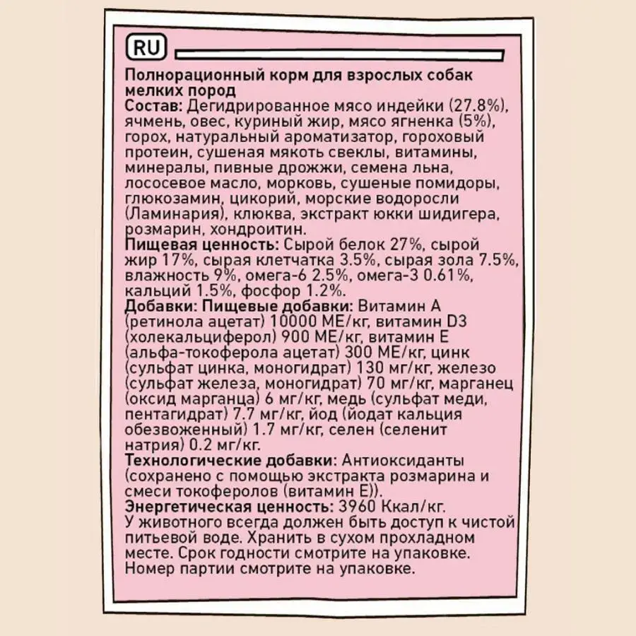 Формула ZILLI ADULT SMALL BREED Turkey with Lamb разработана с учетом особенностей мелких пород. В основе рецепта – дегидрированное мясо индейки и ягненка, которые являются ценными источниками легкоусвояемого белка и необходимых аминокислот. Индейка – диетический продукт с высокой пищевой ценностью, а ягнятина отличается низкой жирностью и богата селеном, поддерживающим иммунитет.