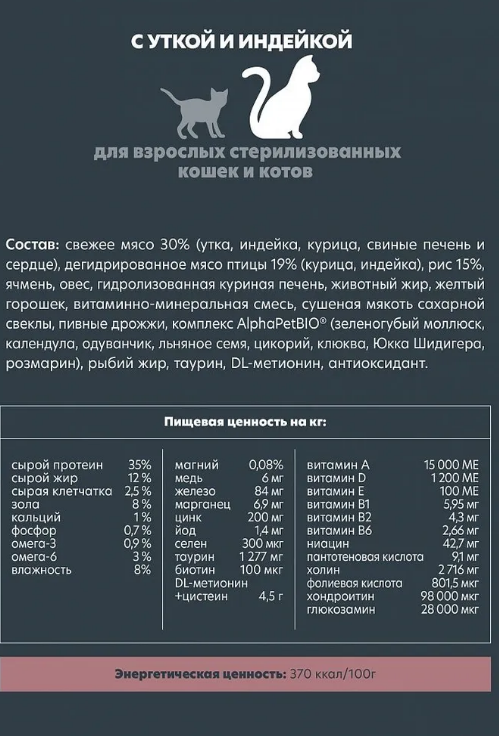 Наш корм — это гармоничное сочетание натуральных ингредиентов и передовых научных разработок, ориентированных на потребности стерилизованных кошек. В его составе — высококачественное свежее мясо индейки, утки и курицы, а также свиная печень и сердце, являющиеся богатым источником белка и незаменимых аминокислот. Дегидрированное мясо птицы и рис обеспечивают сбалансированное питание, легкую усвояемость и насыщенность. Дополнительные витамины, минералы и уникальный комплекс AlphaPetBIO® укрепляют иммунитет и способствуют общему здоровью вашего питомца.