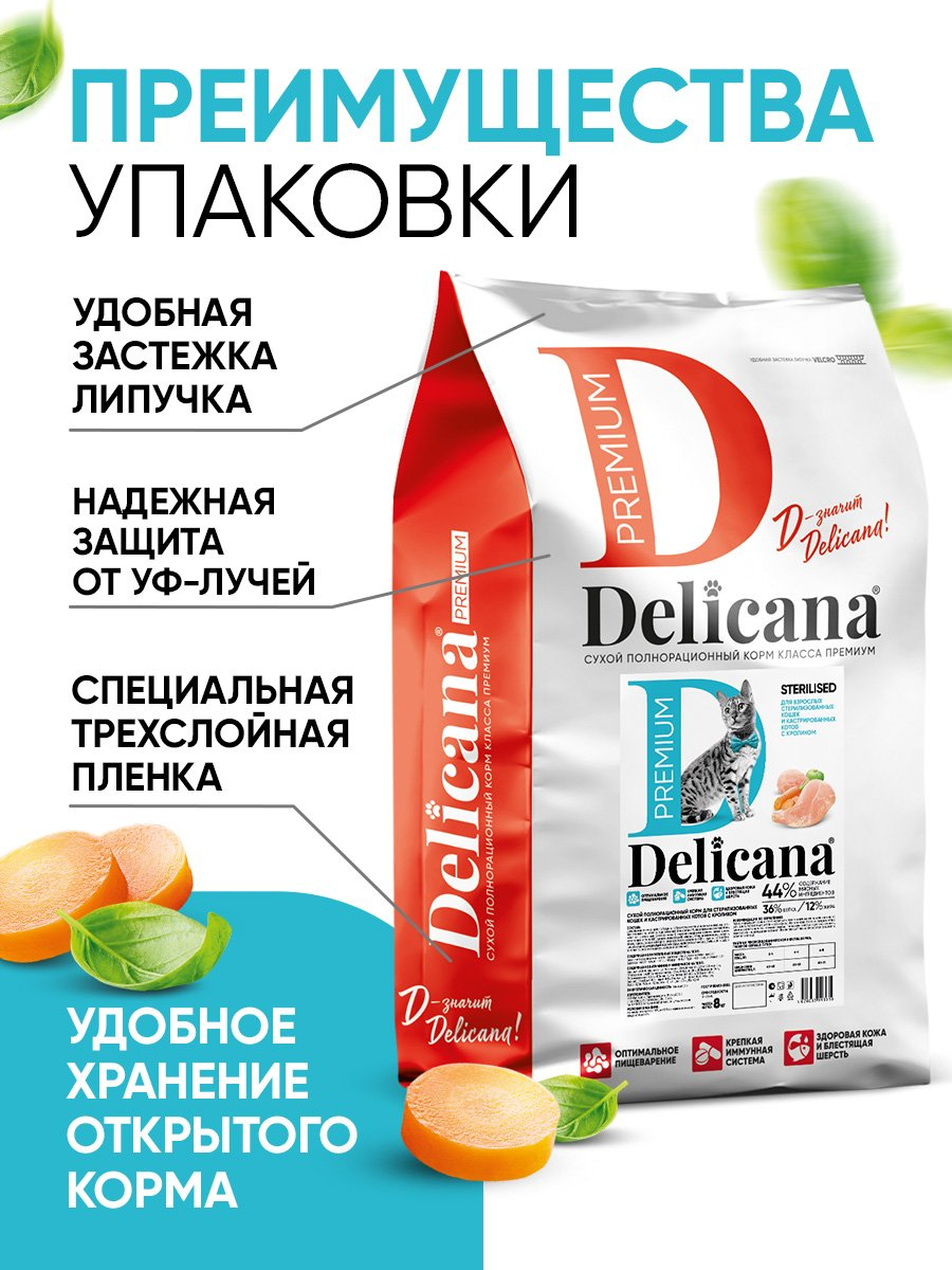 Сухой полнорационный корм для стерилизованных кошек и кастрированных котов с кроликом DELICANA 8кг