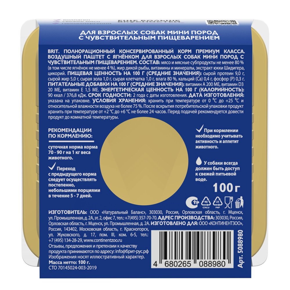 Мясо и мясные субпродукты не менее 80 % (в том числе ягнёнок не менее 4 %), жир дикой рыбы, витамины и минералы, экстракт юкки Шидигера, цикорий. Пищевая ценность на 100 г (средние значения): сырой протеин 9,0 г, сырой жир 5,0 г, сырая зола 1,0 г, сырая клетчатка 1,0 г, влага 80 %, кальций (Са) 0,4 г, фосфор (P) 0,3 г. Питательные добавки на 100 г (средние значения): витамин А 200 МЕ, витамин D3 20 МЕ, витамин Е 1,5 МЕ. Энергетическая ценность на 100 г (калорийность): 90 ккал / 376,8 кДж.
