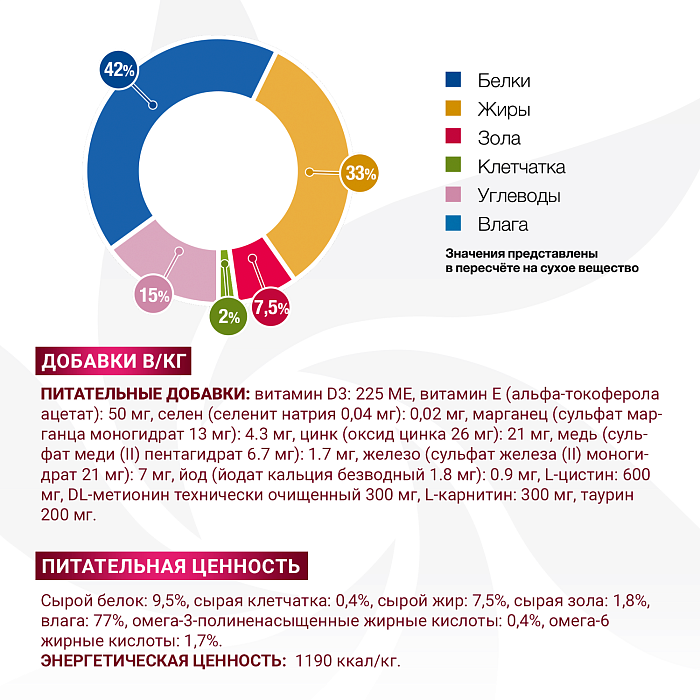 Питательная ценность: сырой белок 9,5%, сырая клетчатка 0,4%, сырой жир 7,5%, сырая зола 1,8%, влага 77%, омега-3 жирные кислоты 0,4%, омега-6 жирные кислоты 1,7%.