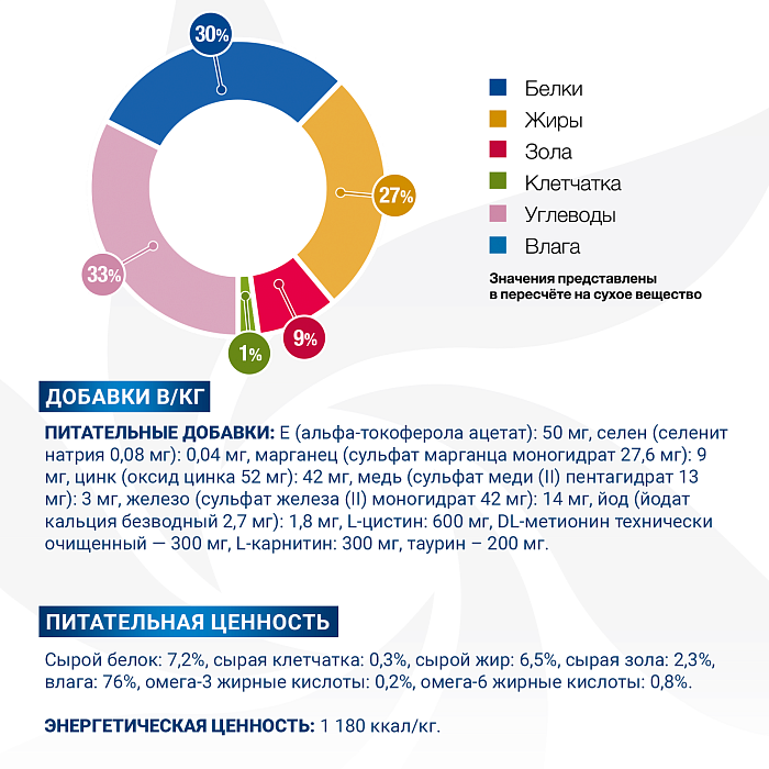 Питательные добавки на кг: витамин D3: 450 МЕ, витамин Е (альфа-токоферола ацетат): 50 мг, селен (селенит натрия 0,08 мг): 0,04 мг, марганец (сульфат марганца моногидрат 27,6 мг): 9 мг, цинк (оксид цинка 52 мг): 42 мг, медь (сульфат меди (II) пентагидрат 13 мг): 3 мг, железо (сульфат железа (II) моногидрат 42 мг): 14 мг, йод (йодат кальция безводный 2,7 мг): 1,8 мг, L-цистин: 600 мг, DL-метионин технически чистый - 300 мг, L-карнитин: 300 мг, таурин – 200 мг.