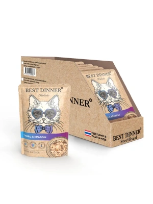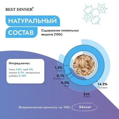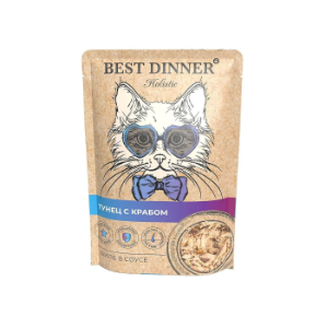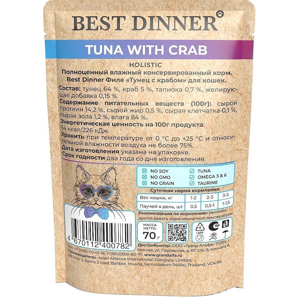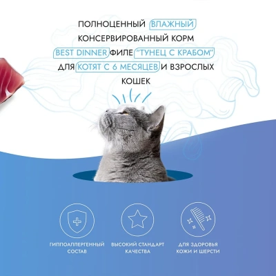 HOLISTIC Полнорационный влажный консервированный корм. Best Dinner Филе "Тунец с крабом" для взрослых кошек. Нежное розовое мясо стейковой части тунца и мяса краба. Без добавления субпродуктов, сои, ароматизаторов и консервантов. Высокоусвояемый и гипоалергенный рацион с высоким содержанием белка и низким содержанием жира. Богат незаменимыми жирными кислотами Омега-3 и Омега-6, которые придают шерсти кошки блеск и красоту. А так же содержит необходимые витамины и минералы для здоровья кошки. Уникальный состав, текстура и способ производства: бланшированное мясо стейковой части тунца и мяса краба, разделенное на мелкие волокна в соусе. Состав: Тунец 64%, краб 5%, тапиока 0,7%, желирующая добавка 0,15%, L-карнитин 0,1%.