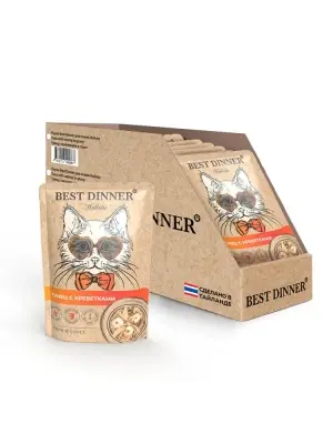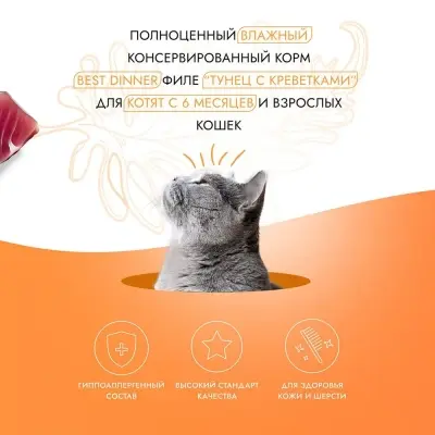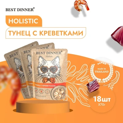 HOLISTIC Полнорационный влажный консервированный корм. Best Dinner Филе "Тунец с креветками" для взрослых кошек. Нежное розовое мясо стейковой части тунца с добавлением цельных креветок. Без добавления субпродуктов, сои, ароматизаторов и консервантов. Высокоусвояемый и гипоалергенный рацион с высоким содержанием белка и низким содержанием жира. Богат незаменимыми жирными кислотами Омега-3 и Омега-6, которые придают шерсти кошки блеск и красоту. А так же содержит необходимые витамины и минералы для здоровья кошки. Уникальный состав, текстура и способ производства: бланшированное филе тунца, разделенное на мелкие волокна с добавлением цельных креветов в соусе. Состав: Тунец 65%, креветки 8%, тапиока 0,7%, желирующая добавка 0,15%, L-карнитин 0,1%