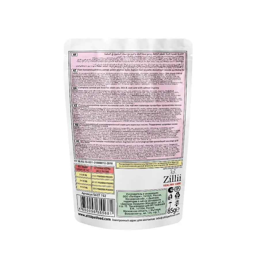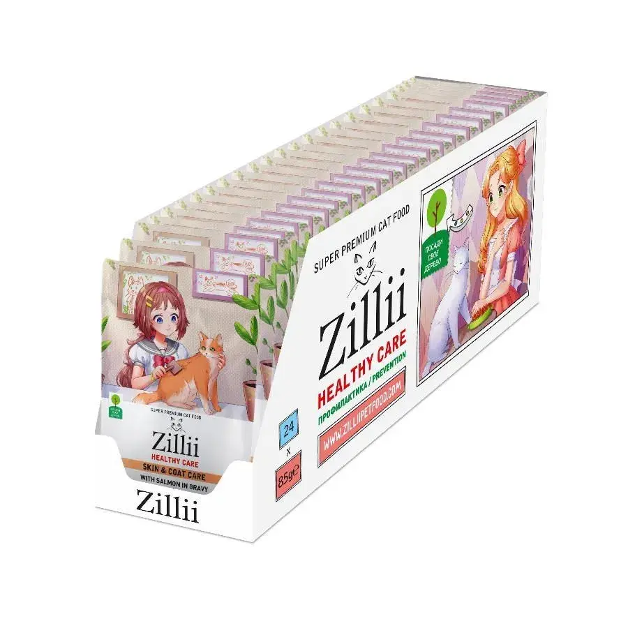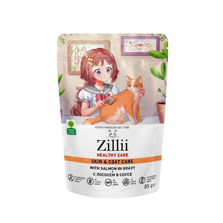 Ищете эффективное решение для поддержания здоровья кожи и красоты шерсти вашего питомца? Представляем влажный корм ZILLI Cat Skin & Coat Care с лососем в соусе — полноценный рацион, созданный специально для взрослых кошек, нуждающихся в особом уходе за кожными покровами и шерстяным покровом.