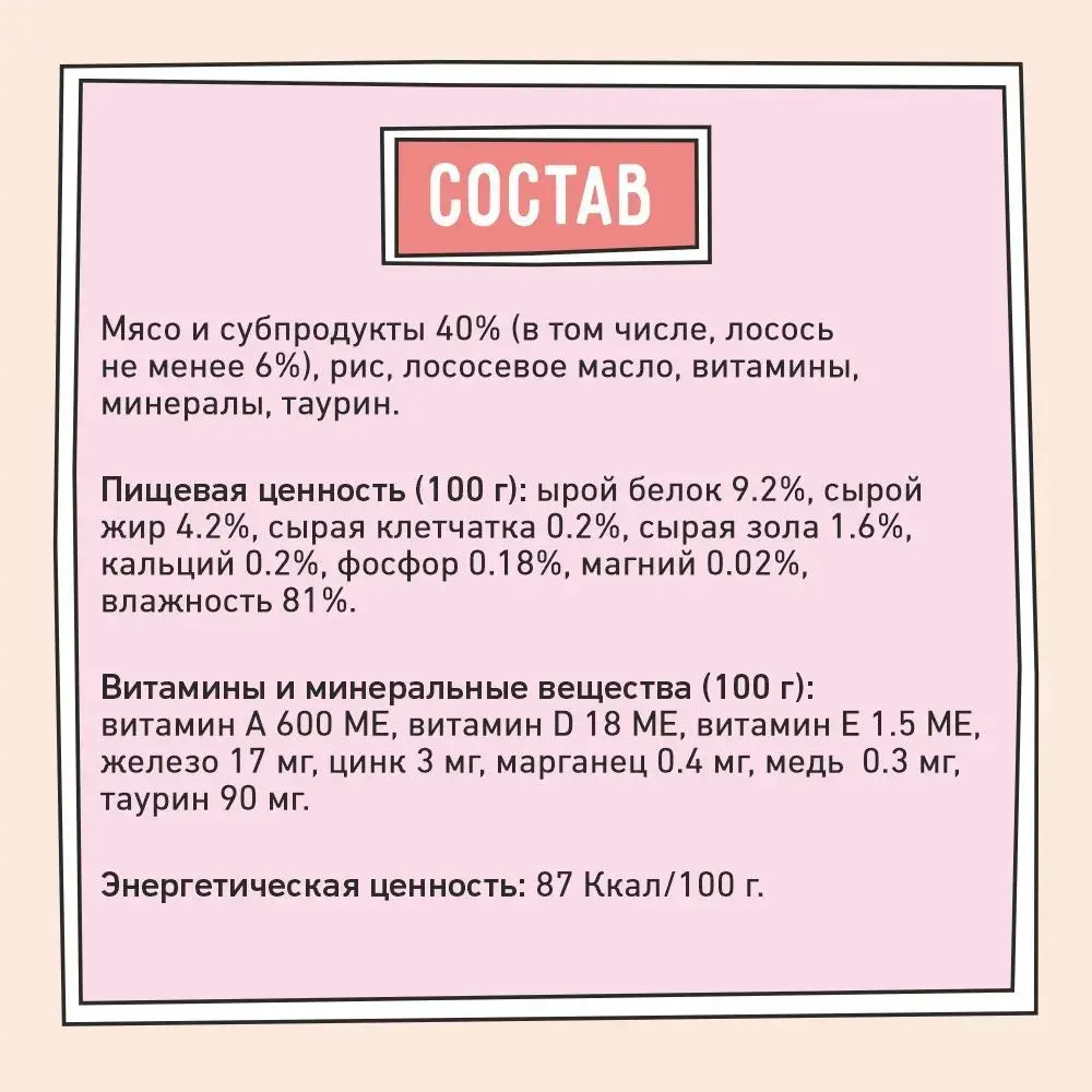 Каждая порция содержит 9,2% сырого белка и 4,2% жира при высокой влажности (81%), что обеспечивает сбалансированное питание и поддерживает оптимальный вес животного. Энергетическая ценность — 87 ккал на 100 грамм. Корм также учитывает PH-баланс, что важно для здоровья мочевыводящей системы.