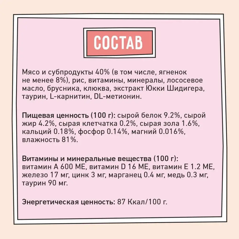 В составе влажного корма ZILLI содержится не менее 8% ягненка и 40% мясных ингредиентов, дополненных рисом, лососевым маслом, витаминами и минералами. Особое внимание уделено натуральным компонентам — экстракту Юкки Шидигера, бруснике и клюкве, которые оказывают противовоспалительное действие и способствуют выведению токсинов. Добавки таурина, L-карнитина и DL-метионина усиливают общий оздоровительный эффект, помогая поддерживать работу сердца и обмен веществ.