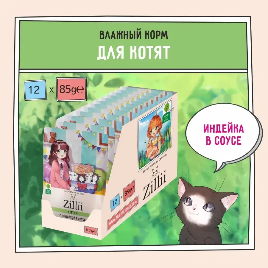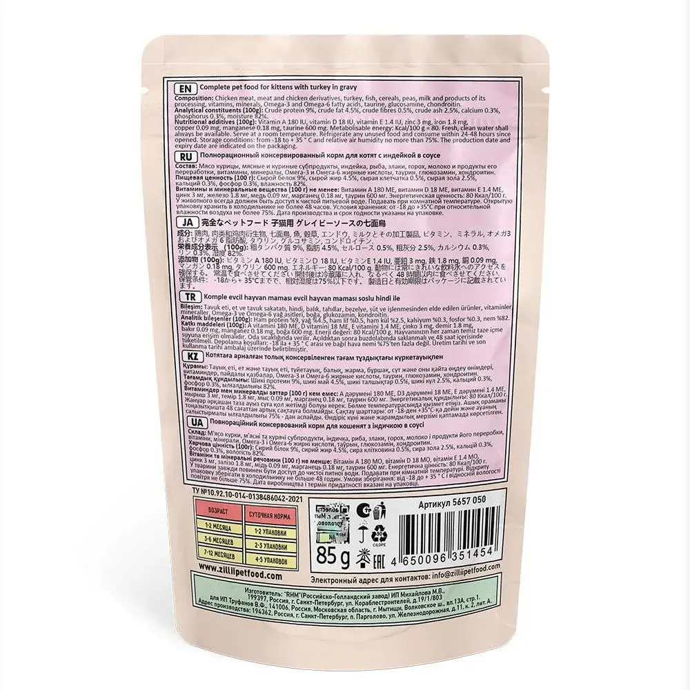Растущий котёнок нуждается в особом питании, чтобы получать все необходимые витамины, минералы и питательные вещества. Zilli корм для котят влажный серии Kitten Turkey в соусе — это полнорационный продукт, созданный специально для поддержки активного развития вашего питомца с первых дней жизни.