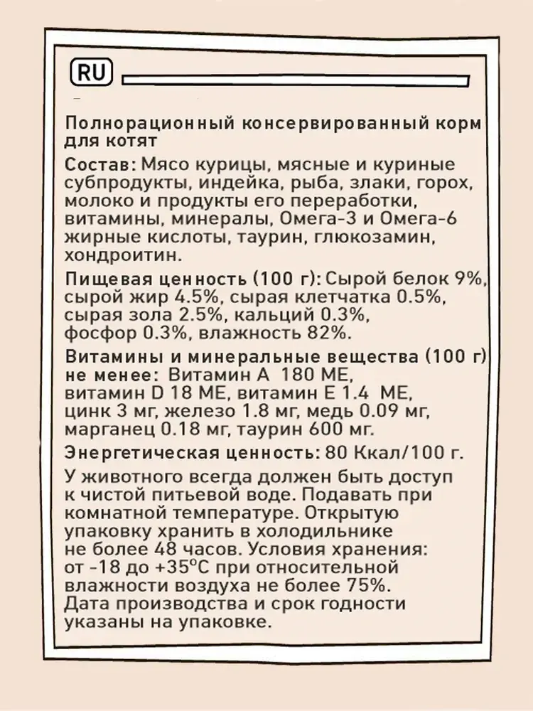 - Энергетическая ценность — 80 ккал на 100 г, идеально подходящая для активных котят