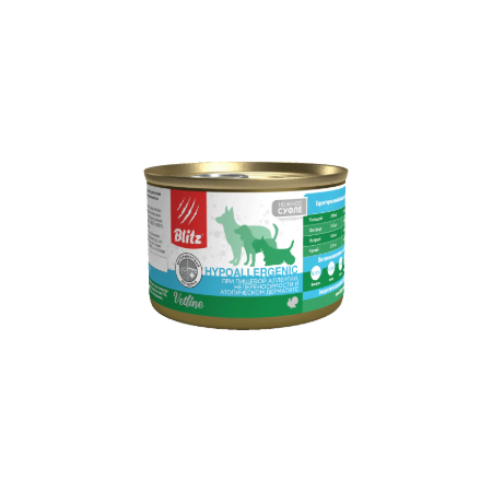 Консервированный корм Blitz Hypoallergenic Dog — это вкусный и полезный паштет для собак, склонных к расстройствам пищеварения, аллергическим реакциям и атопическому дерматиту. Применяется по назначению врача как основное питание и важнейший элемент восстановления здоровья, а в некоторых случаях можно обойтись только этим диетическим рационом, не прибегая к лекарственным препаратам. Рацион представляет собой полнорационное диетическое питание, разработанное для обеспечения потребностей собак в белках, жирах, клетчатке, витаминах и минералах. Используемые в составе дополнительные компоненты позволяет питомцам быстрее восстановить нормальное пищеварение и целостность кожно-шерстного покрова, а также избежать рецидивов пищевой непереносимости и кожных воспалений аллергического характера.