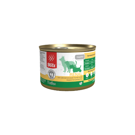 В составе консервов Blitz Renal для собак ограниченное количество белка (из индейки, яиц и семян киноа), а также низкие показатели фосфора и натрия. Такие характеристики позволяют контролировать поступление в кровь креатинина и предотвращают у животных перепады давления и проблемы с сердцем.