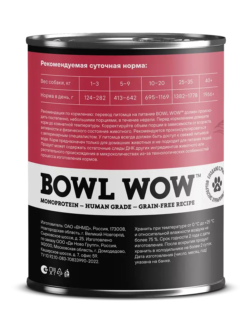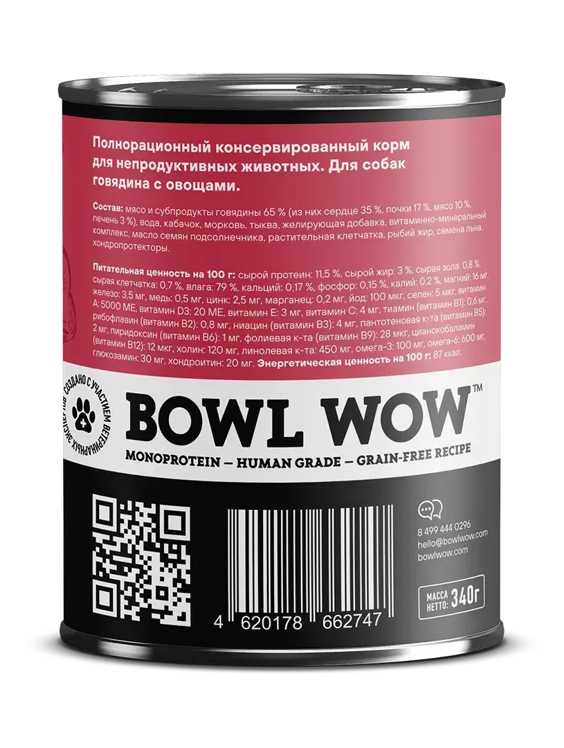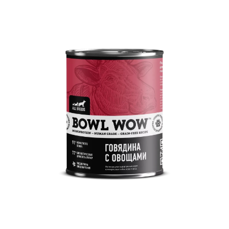 Полнорационный влажный корм в виде консервов BOWL WOW «Говядина с овощами» разработан для взрослых собак всех пород из натуральных ингредиентов human grade качества. Беззерновая монопротеиновая формула на основе говядины содержит 91% животного белка с оптимальным аминокислотным профилем, необходимым для организма вашего питомца, и отличается высокой биологической ценностью и питательностью. Она подойдет даже для чувствительных питомцев, страдающих аллергией и непереносимостью других видов белка.
