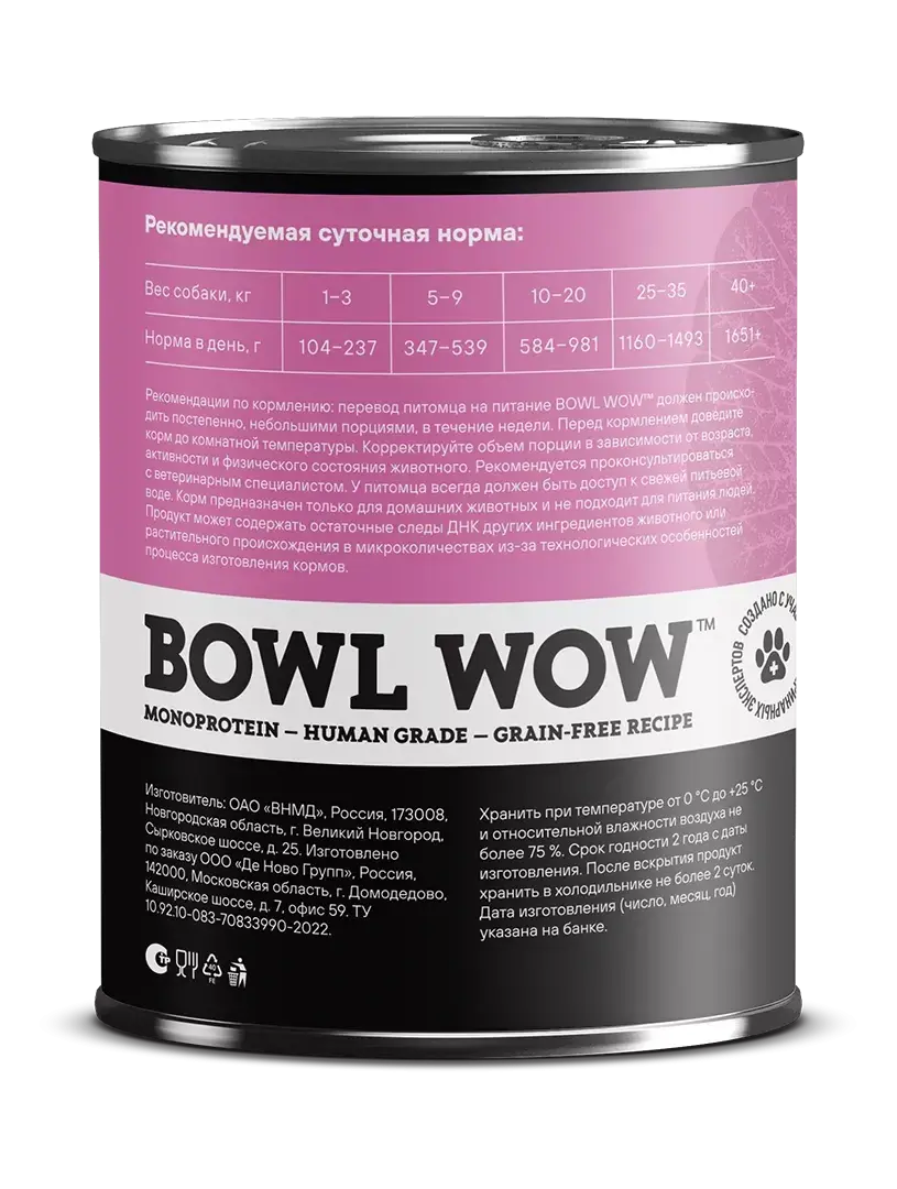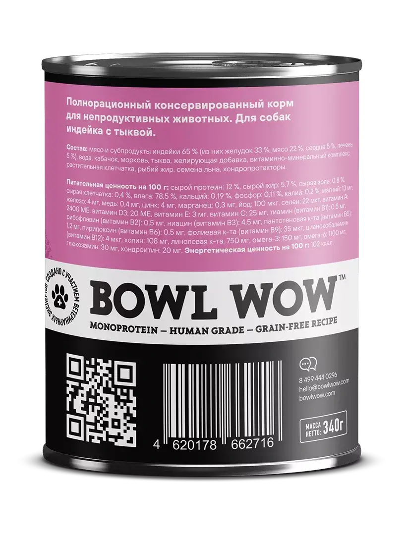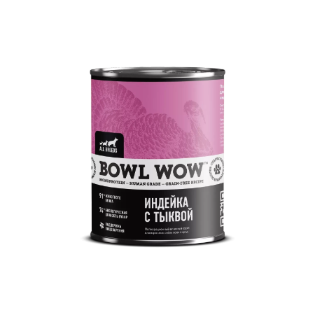 Полнорационный влажный корм в виде консервов BOWL WOW «Индейка с тыквой» разработан для взрослых собак всех пород из натуральных ингредиентов human grade качества. Беззерновая монопротеиновая формула на основе индейки содержит 91% белка с оптимальным аминокислотным профилем, необходимым для организма вашего питомца, и отличается высокой биологической ценностью и питательностью. Она подойдет даже для чувствительных питомцев, страдающих аллергией и непереносимостью других видов белка.