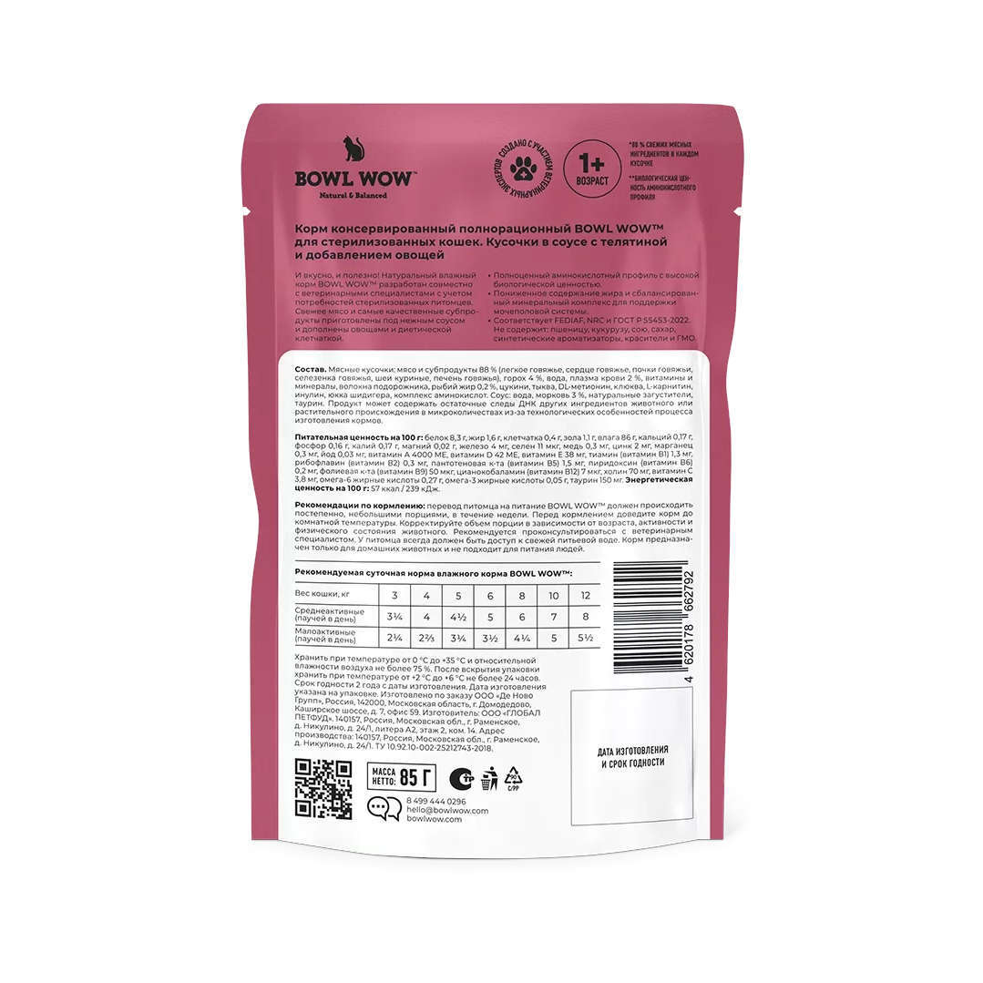 Влажный корм для стерилизованных кошек беззерновой с телятиной и овощами в соусе BOWL WOW 0,085 г. 12 упаковок