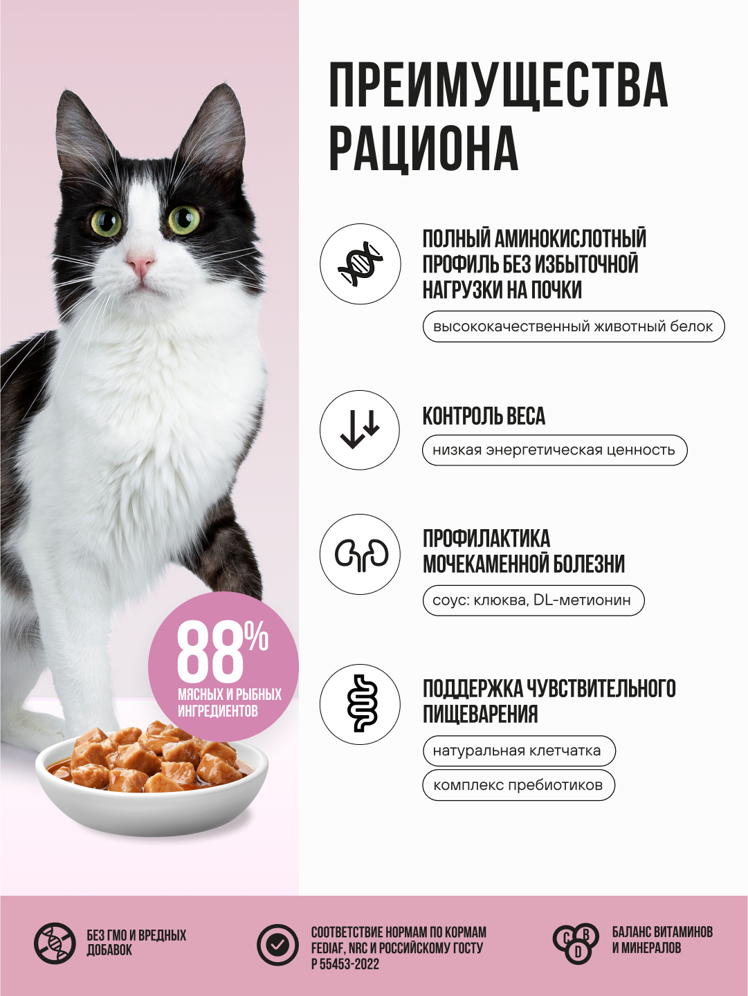 • Профилактика мочекаменной болезни благодаря правильному соотношению кальция, фосфора, магния и добавлению клюквы для здоровья мочевыделительной системы.
