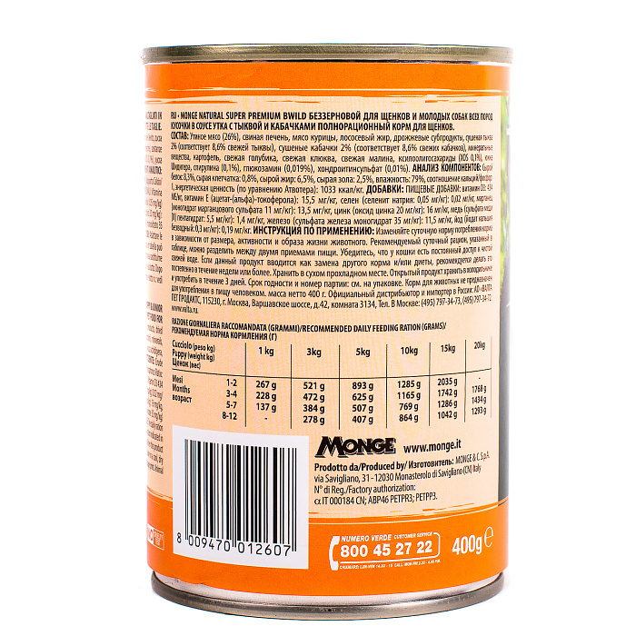 Monge (Монж) Dog BWild GRAIN FREE Puppy&Junior беззерновые (холистик) полнорационные беззерновые консервы из мяса утки с тыквой и кабачками для щенков 400 г.