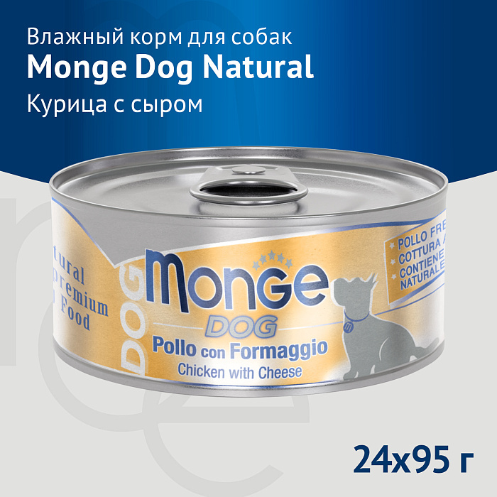 Влажный корм Monge Dog Natural для собак куриные кусочки с сыром, консервы 95 г. Дополнительное питание Monge Natural для взрослых собак, консервы из кусочков свежей курицы. Настоящий деликатесдля четвероногих гурманов приготовленных на пару из высококачественных продуктов. Основой рационов является кусочки свежей курицы с безлактозным сыром. Продукт обогащен рисом - источником натуральной клетчатки, и не содержит искусственные добавки, красители и консерванты. Консервы производят в Таиланде, что позволяет использовать только свежие и высококачественные ингредиенты.