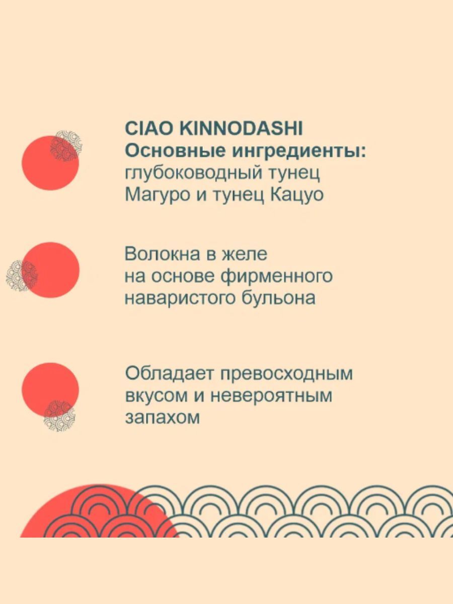 Суперпремиальный влажный корм для кошек Kinnodashi от японского производителя Inaba приготовлен на основе нежных кусочков мяса двух разных видов глубоководного тунца с морским гребешком в аппетитном насыщенном бульоне золотистого цвета. Корма и лакомства Inaba отличаются высоким качеством и неповторимым вкусом, ведь они изготавливаются на основе отборных традиционных японских ингредиентов! Во все продукты добавлен экстракт зеленого чая, который, благодаря содержанию катехина, обладает нейтрализующим действием на запах содержимого кишечника. Корм обогащён витамином Е - натуральным антиоксидантом, поддерживающим иммунную систему, не содержит искусственных добавок, красителей и консервантов. Ингредиенты: тунец Кацуо, тунец Магуро, крахмал, экстракт морского гребешка, экстракт тунца Кацуо, агар-агар, загуститель, экстракт зеленого чая, краситель (красный ферментированный рис) Аналитический состав: белки - 13%, жиры - 2,5%, клетчатка - 0,3%, зола - 0,8%, влажность- 83%.