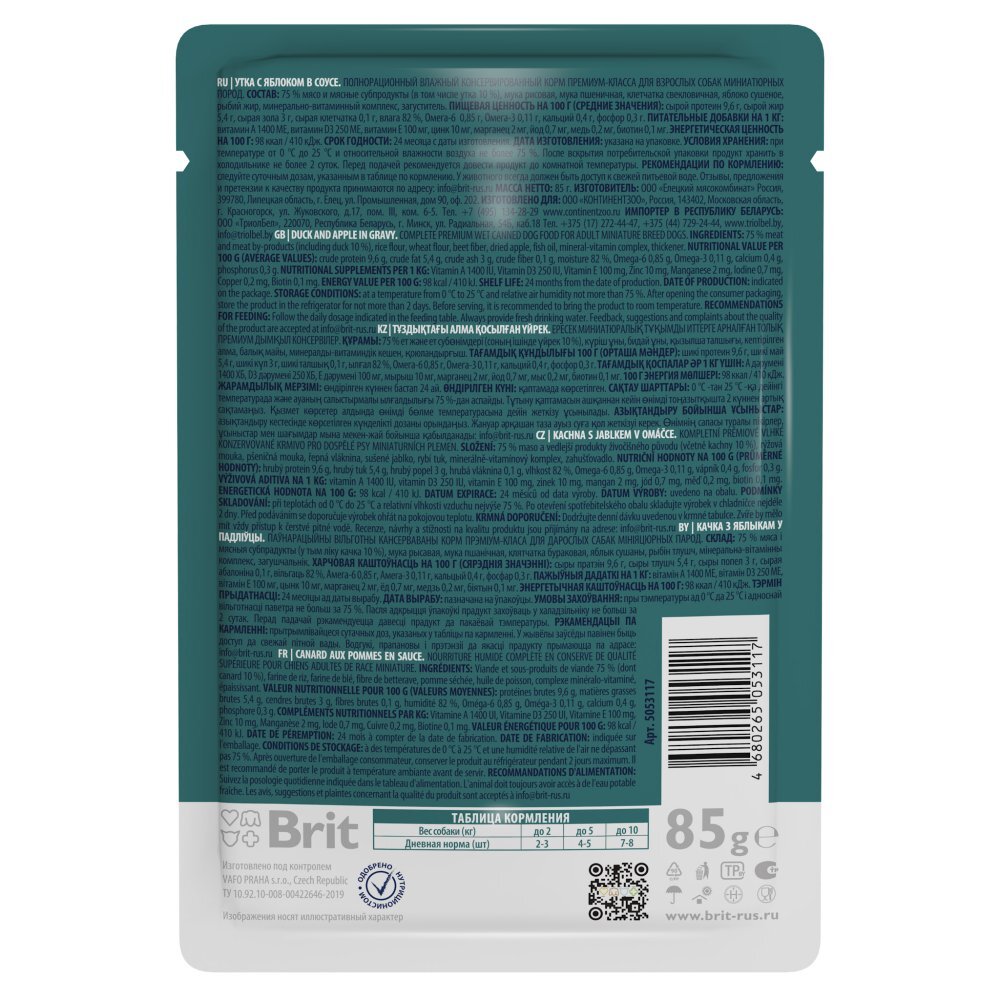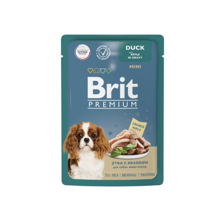 Влажный корм премиального качества содержит 75 % свежего мяса и все необходимые витамины и минералы для ежедневного рациона. Паучи отлично дополнят полнорационный сухой корм Брит Премиум и внесут разнообразие в питание Вашего питомца.