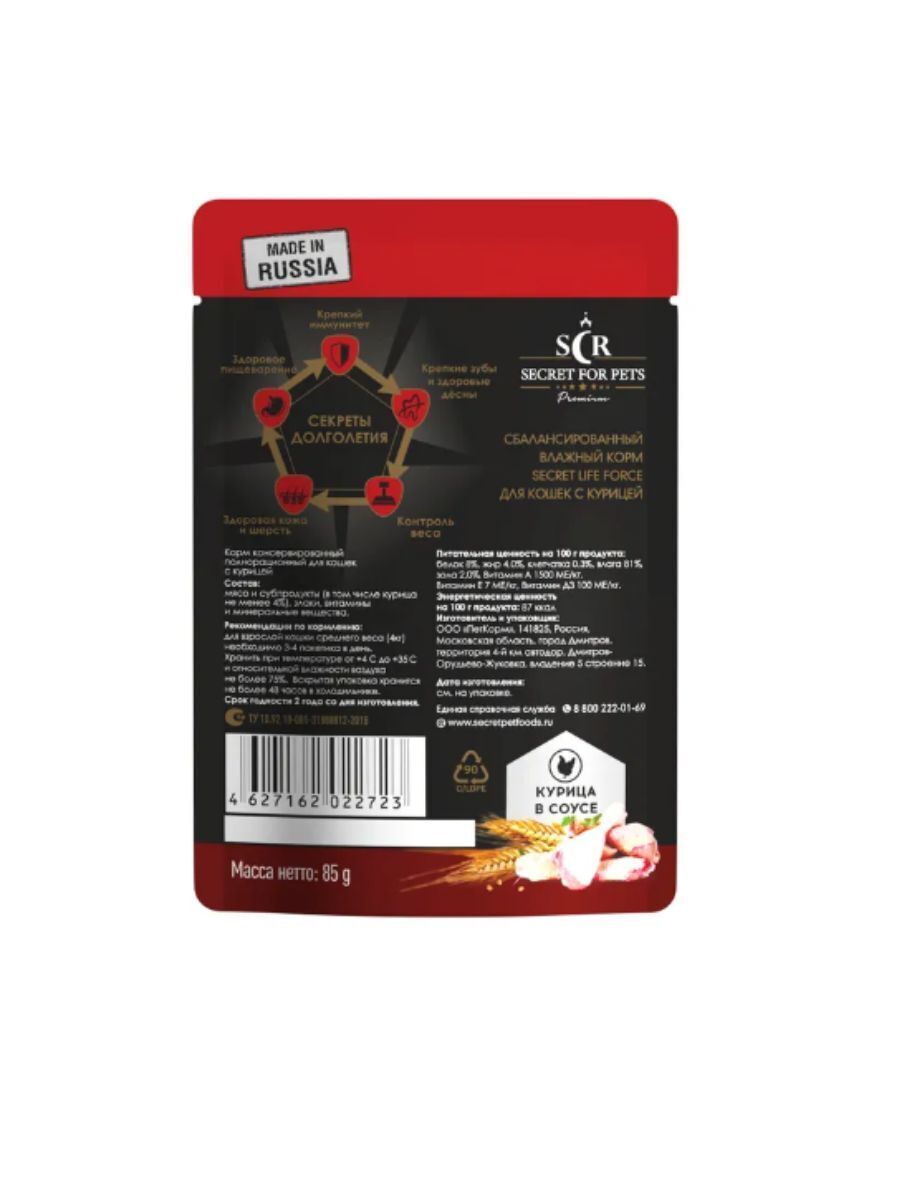 Секрет (Secret) Life Force 0,085кг курица в соусе пауч для кошек (22723). Это сытные консервированные рационы из настоящего мяса, являющегося основой здорового питания кошки. Крепкий иммунитет Крепкие зубы и здоровые дёсны Контроль веса Здоровая кожа и шерсть Здоровое пищеварение В состав продукта входят только натуральные и сбалансированные ингредиенты, что способствует хорошей усвояемости корма организмом животного. Консервы для кошек Секрет не содержат вредных добавок, усилителей вкуса и не вызывают привыкания. Состав: мясо и субпродукты (в том числе курица не менее 4%), злаки, витамины и минеральные вещества. Пищевая ценность в 100 г продукта: белок 8%, жир 4%, клетчатка 0,3%, влага 81%, зола 2%, Витамин А 1500 МЕ/кг, Витамин Е 7 МЕ/кг, Витамин Д3 100 МЕ/кг. Энергетическая ценность в 100 г продукта: 87 ккал. Масса нетто: 85 г. Срок годности: 2 года со дня изготовления. Изготовлено из натурального российского мясного сырья. Рекомендуется употреблять при комнатной температуре. После вскрытия потребительской упаковки продукт хранить в холодильнике не более 2 суток. В комплекте 24 Упаковок