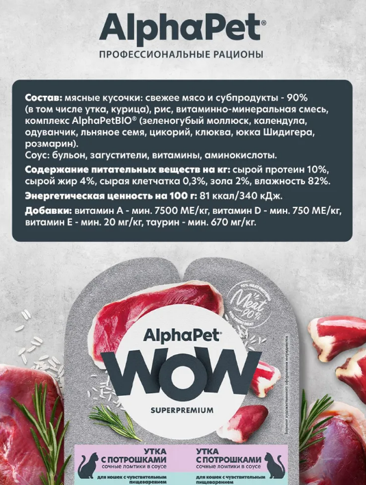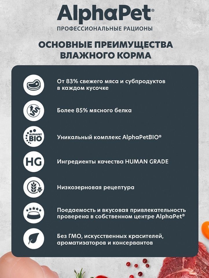 Здоровье и активность вашего питомца - важнейшая задача для каждого заботливого хозяина. Команда AlphaPet создает и производит альфапет корма для кошек. Корм для кошек влажный высшего качества Holistiс, чтобы вы могли быть уверены в том, что ваш любимец получает все необходимое для здоровья и счастья. AlphaPet SUPERPREMIUM - это уникальное питание на основе натуральных ингредиентов, которое подойдет для стерилизованных кошек. Наша линейка питания разработана специально для владельцев, которые ценят качество и заботятся о здоровье своих питомцев. Для приготовления влажного корма для кошек мы используем инновационные технологии и только свежее мясо, чтобы обеспечить вашего питомца всем необходимым.