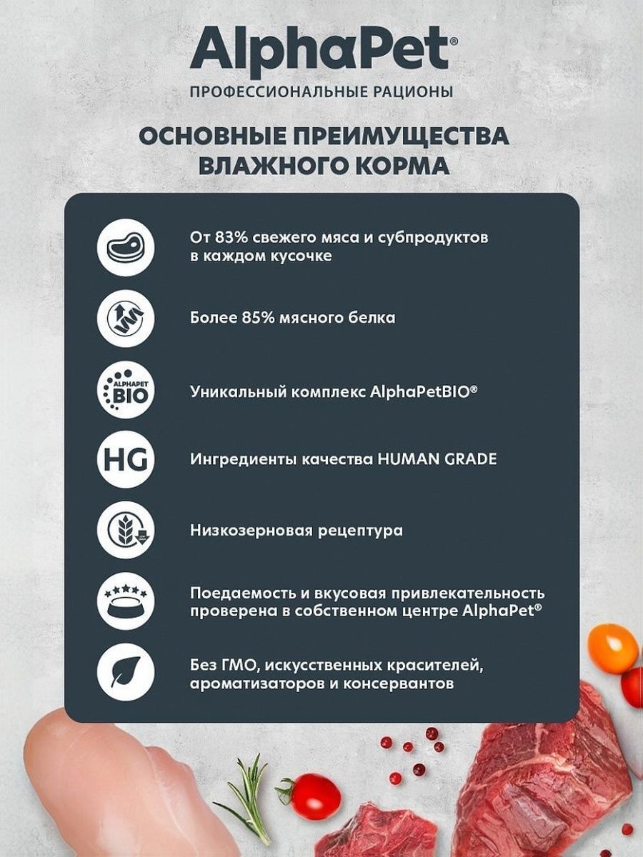 Влажный корм для собак AlphaPet WOW - это линейка кормов высокого качества по доступной цене. Мы понимаем, что каждый хозяин хочет дать своему питомцу лучшее, поэтому мы создали эту линейку для тех, кто ценит качество по разумной цене. Наши корма содержат более 90% мясного белка и приготовлены по инновационной технологии из свежих ингредиентов. Влажные корма AlphaPet также содержат уникальные ингредиенты высокого качества, такие как Human Graid, уникальный комплекс AlphaPetBio, рис для чувствительного пищеварения. Мы гарантируем, что наши корма не содержат ГМО, искусственных красителей, ароматизаторов, консервантов, пшеницы, кукурузы и глютена. Мы уделяем особое внимание качеству ингредиентов, чтобы обеспечить вашему питомцу полноценное и сбалансированное питание. Наши мясные ломтики содержат свежее мясо и субпродукты, рис, витаминно-минеральную смесь, рыбий жир и комплекс AlphaPetBIO.