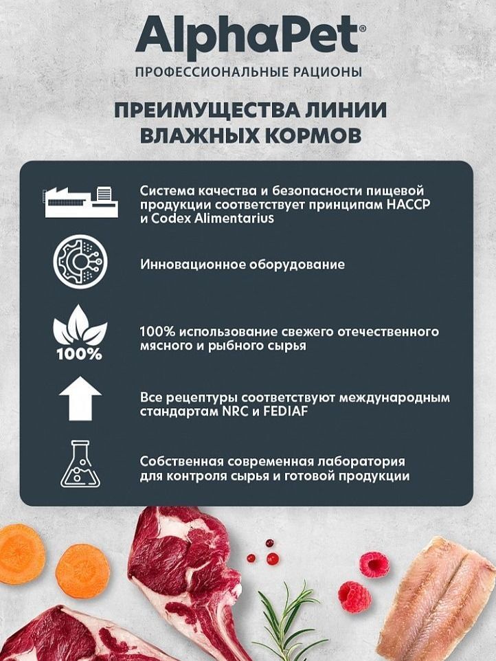 Здоровье и активность вашего питомца - важнейшая задача для каждого заботливого хозяина. Команда AlphaPet создает и производит корм для кошек влажный высшего качества Holistiс, чтобы вы могли быть уверены в том, что ваш любимец получает все необходимое для здоровья и счастья. AlphaPet SUPERPREMIUM - это уникальное питание на основе натуральных ингредиентов, которое подойдет для стерилизованных кошек. Наша линейка питания разработана специально для владельцев, которые ценят качество и заботятся о здоровье своих питомцев. Для приготовления влажного корма для кошек мы используем инновационные технологии и только свежее мясо, чтобы обеспечить вашего питомца всем необходимым.